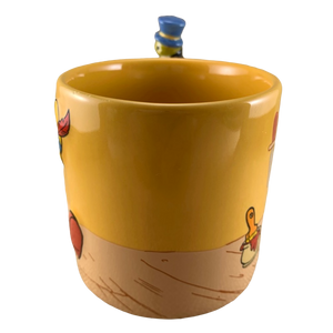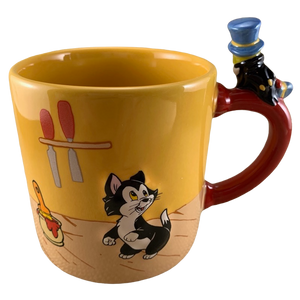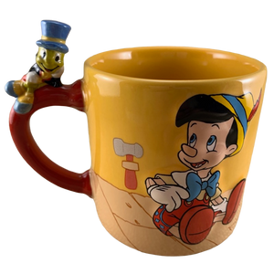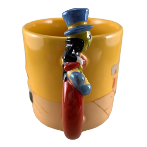 There is a 3D figural Jiminy Cricket on top of the red handle.