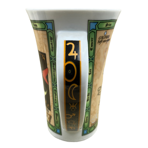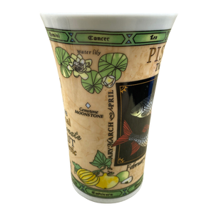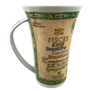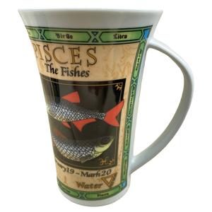 This is a tall mug with a broad handle that features artwork relating to the Zodiac sign Pisces wrapping arounf its exterior surface and on the handle.