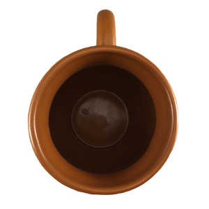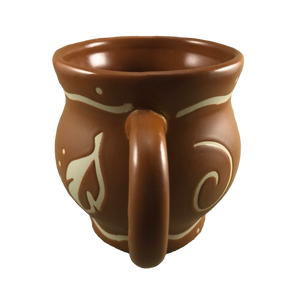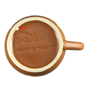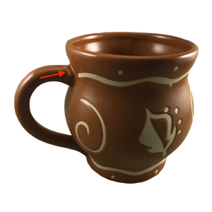 Condition note: there is a white spot on the bottom and rim that appears to be a bit of extra ceramic material that is from the manufacturing process. Please see the last photo where a red arrow is pointing to this. On the handle there is a small area where the brown paint did not completely cover the ceramic material. Please see the last photo where a red arrow is pointing to this. There's a similar spot on the top of the handle where it meets the side of the mug, please see the 3rd photo where a red arrow is pointing to this.