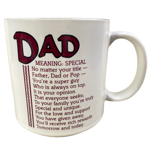 Features the word "DAD" printed in a large font at the top of the front side of the mug. Directly underneath this is a poem about the meaning of the word "DAD."Poetry copyright Marci G.