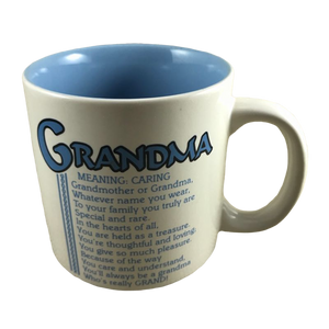 Features the word "Grandma" printed in a large font at the top of the front side of the mug. Directly underneath this is a poem about the meaning of the word "Grandma"