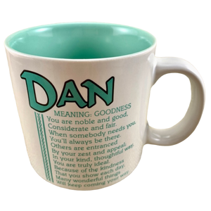 Features the name DAN printed in a large font at the top of the front side of the mug. Directly underneath this is a poem about the name DAN.