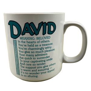 Features the name DAVID printed in a large font at the top of the front side of the mug.  Directly underneath this is a poem about the name DAVID.