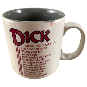 Features the name DICK printed in a large font at the top of the front side of the mug. Directly underneath this is a poem about the name DICK.
