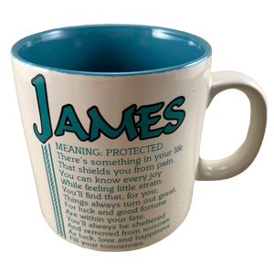 Features the name JAMES printed in a large font at the top of the front side of the mug. Directly underneath this is a poem about the name JAMES.