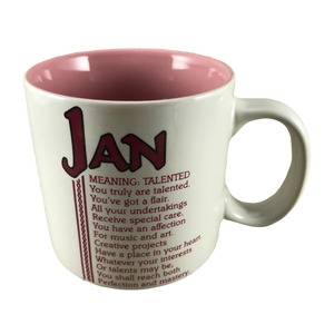 Features the name JAN printed in a large font at the top of the front side of the mug. Directly underneath this is a poem about the name JAN.