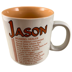 Features the name JASON printed in a large font at the top of the front side of the mug. Directly underneath this is a poem about the name JASON.