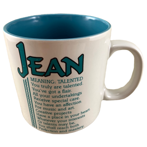 Features the name JEAN printed in a large font at the top of the front side of the mug. Directly underneath this is a poem about the name JEAN.