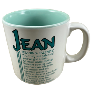 Features the name JEAN printed in a large font at the top of the front side of the mug. Directly underneath this is a poem about the name JEAN.