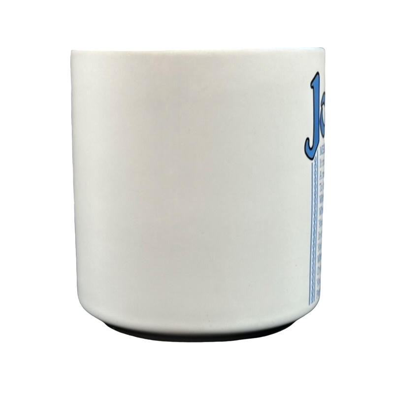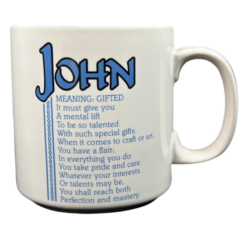 Features the name JOHN printed in a large font at the top of the front side of the mug. Directly underneath this is a poem about the name JOHN.