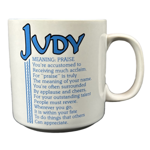Features the name JUDY printed in a large font at the top of the front side of the mug.