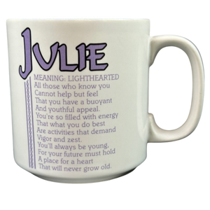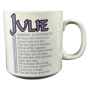 Features the name JULIE printed in a large font at the top of the front side of the mug. Directly underneath this is a poem about the name JULIE.