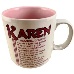 Features the name KAREN printed in a large font at the top of the front side of the mug. Directly underneath this is a poem about the name KAREN.