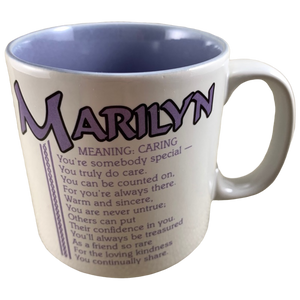 Features the name Marilyn printed in a large font at the top of the front side of the mug. Directly underneath this is a poem about the name Marilyn.