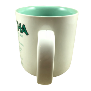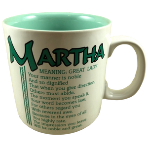 Features the name Martha printed in a large font at the top of the front side of the mug. Directly underneath this is a poem about the name Martha.
