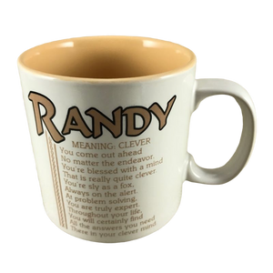 Features the name Randy printed in a large font at the top of the front side of the mug. Directly underneath this is a poem about the name Randy.