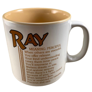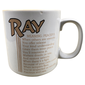 Features the name RAY printed in a large font at the top of the front side of the mug. Directly underneath this is a poem about the name RAY.