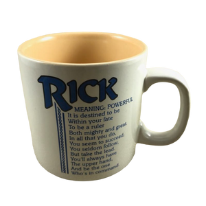 Features the name RICK printed in a large font at the top of the front side of the mug. Directly underneath this is a poem about the name RICK.