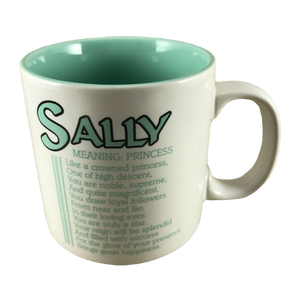 Features the name Sally printed in a large font at the top of the front side of the mug. Directly underneath this is a poem about the name Sally.