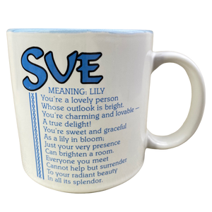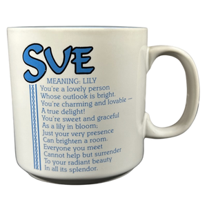 Features the name Sue printed in a large font at the top of the front side of the mug. Directly underneath this is a poem about the name Sue.