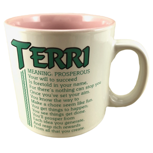 Features the name Terri printed in a large font at the top of the front side of the mug. Directly underneath this is a poem about the name Terri.