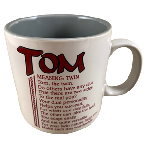 Features the name Tom printed in a large font at the top of the front side of the mug. Directly underneath this is a poem about the name Tom.