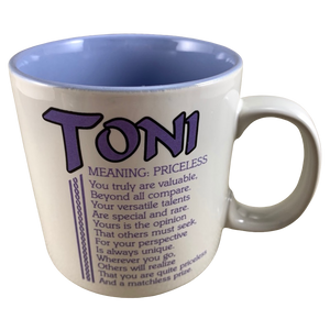 Features the name Toni printed in a large font at the top of the front side of the mug. Directly underneath this is a poem about the name Toni.