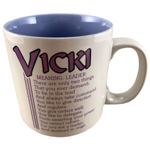 Features the name Vicki printed in a large font at the top of the front side of the mug. Directly underneath this is a poem about the name Vicki.