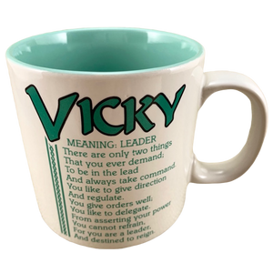 Features the name Vicky printed in a large font at the top of the front side of the mug. Directly underneath this is a poem about the name Vicky.