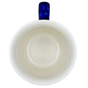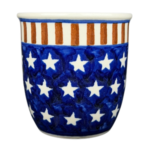 This authentic Boleslawiec Polish pottery mug features a bold, hand-painted patriotic design perfect for Americana collectors. The lower body is wrapped in a deep cobalt blue glaze adorned with crisp white stars, while the upper rim and handle showcase striking vertical red stripes on a creamy white background. A thin blue line separates the star-filled base from the striped collar, creating a classic star-spangled aesthetic. Handcrafted in Poland, this durable stoneware mug is both microwave and dishwasher safe, combining artisanal folk art with modern convenience for your daily coffee or tea.