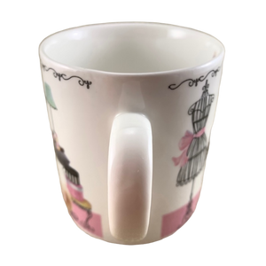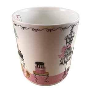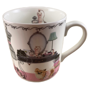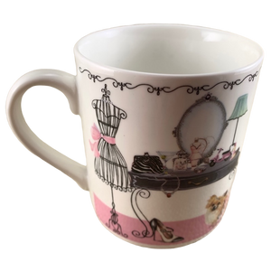 This is a very unique mug that features the same artwork on its front and rear surface consisting of a dog which I think is a a Pomeranian under a table with many lady's fashion items on or near it. Please see the photos as this one is difficult to describe.