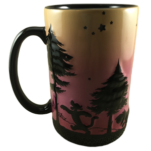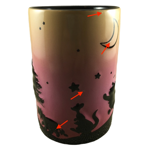 Features embossed artwork wrapping around its exterior surface. This artwork includes silhouettes of Pooh and all of his friends along with trees, stars, and the moon.