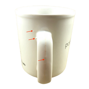 Condition note: this mug has no chips, cracks, scratches or crazing. There are some minor irregularities on the exterior surface and a light orange line running down the center of the handle, please see the red arrows pointing to these in the last photo.