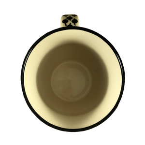 There is dual band of blue trim wrapping around the rim and a triple band wrapping around the lower part of the mug near the base.