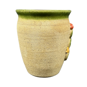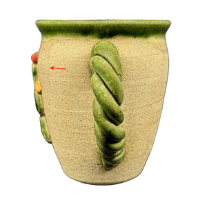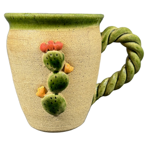 This pottery mug features embossed 3D prickly pear cacti on its front surface.