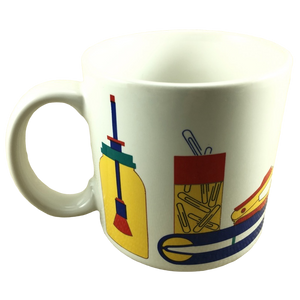 Features artwork wrapping around the surface consisting of various different office supplies.