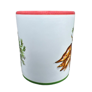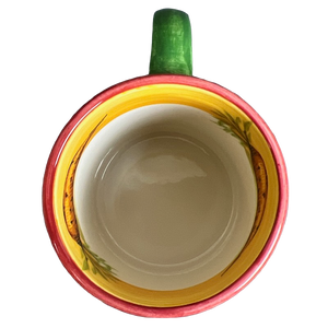 On the exterior surface there is a band of reddish orange trim wrapping around the rim and a band of green trim wrapping around the base.