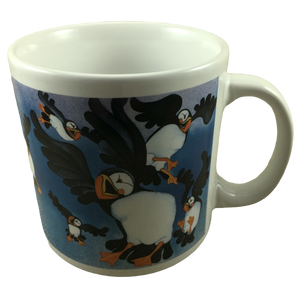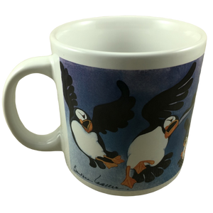 Features artwork on the exterior surface consisitng of puffins in various positions.