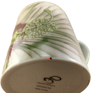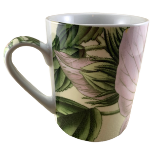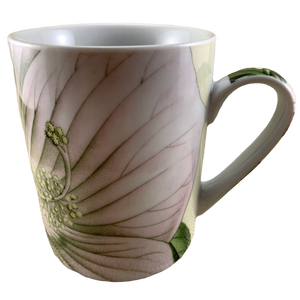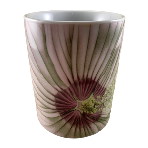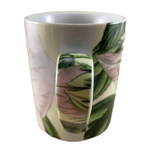 Features beautiful pink flowers wrapping around its exterior surface and on the handle.