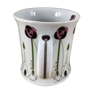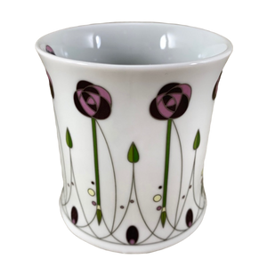 Features purple flowers in a somewhat abstract pattern wrapping around its exterior surface.