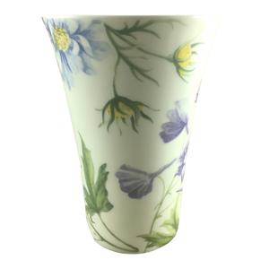 Features beautiful artwork wrapping around its exterior surface consisting of yellow and purple flowers.