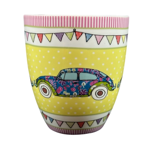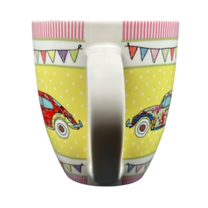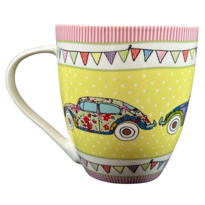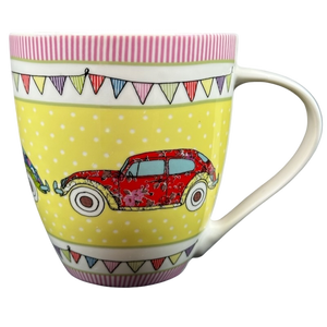 Features three different cars that appear to be Volkswagen Bugs wrapping around its exterior surface.