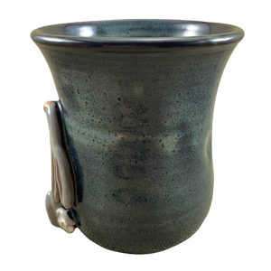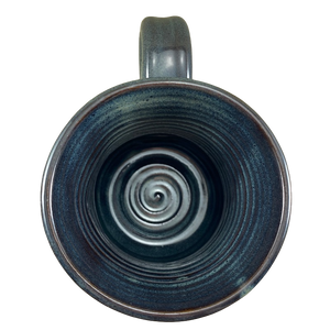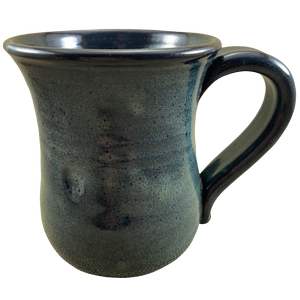 This is a hand thrown mug with a beautiful finish in shades of blue mixed with a bit of brown.