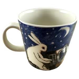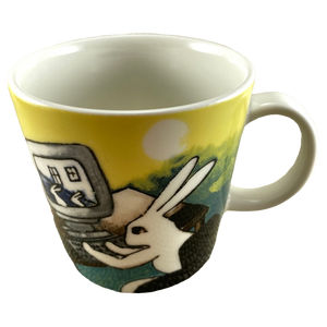 Features a bunny typing on a computer in a daylight scene on its front surface and a similar scene of the bunny at nighttime on the rear surface.