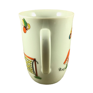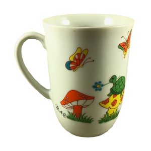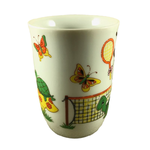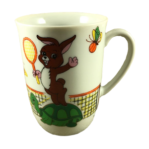 Here's a highly unusual and rare mug. It features vibrant and coiorful artwork of a rabbit holding a badminton racquet and riding on top of a turtle. Also pictured are butterflies and a mushroom.