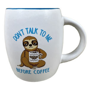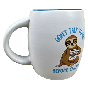 Printed above the sloth is "DON'T TALK TO ME" and printed beneath it is "BEFORE COFFEE."