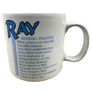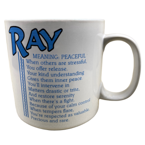 Features the name RAY printed in a large font at the top of the front side of the mug. Directly underneath this is a poem about the name RAY.