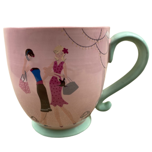 Features artwork on its from surface depicting 2 ladies carrying bags with several other bags on the floor near them.