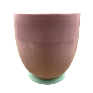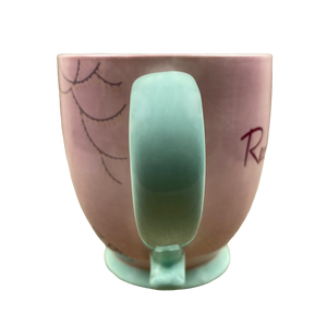 This is a pedestal mug with a fancy handle. The pedestal base and handle are both finished in the same shade of green.