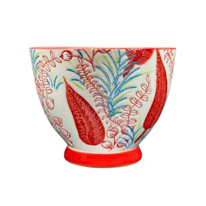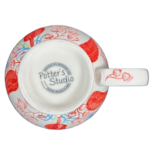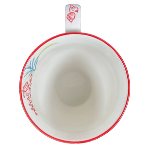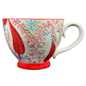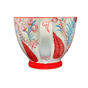 Features lightly embossed red flowers and leaves wrapping around its exterior surface and on the handle.